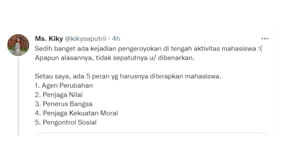 "Sedih banget ada kejadian pengeroyokan di tengah aktivitas mahasiswa. Apapun alasannya, tidak sepatutnya untuk dibenarkan. Setau saya, ada 5 peran yang harusnya diterapkan mahasiswa," tulis Kiky Saputri melalui akun Twitternya.